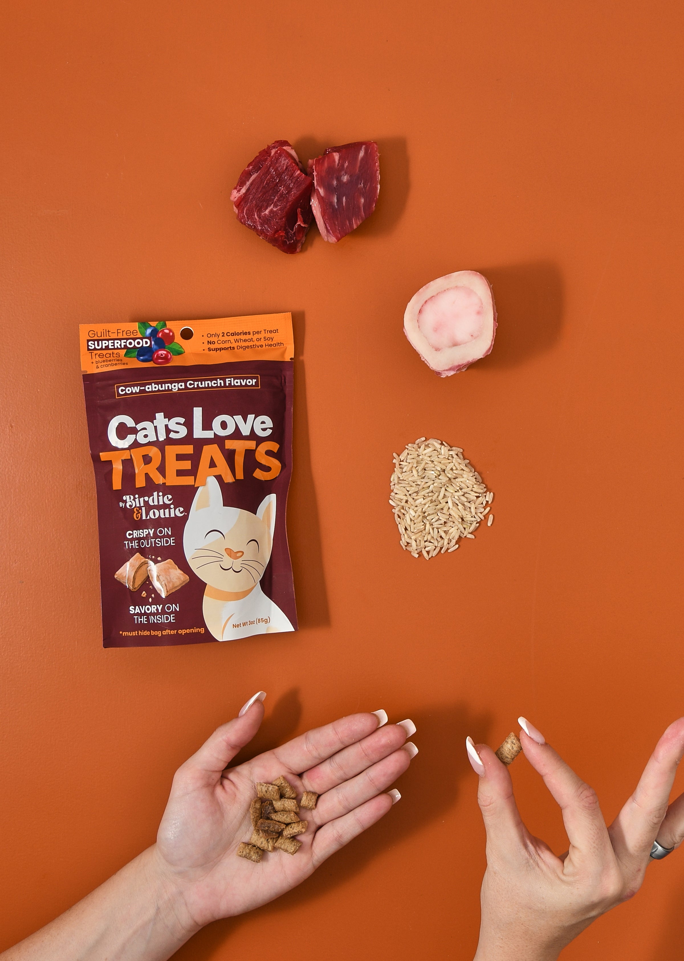 At Birdie & Louie™, we don’t do boring. We make cat treats with sass, substance, and serious snack appeal. Each crunchy little bite is packed with nutrient-rich bone marrow, and superfood add-ins (think probiotics, berries, omega-3s, and even mango). Oh, and did we mention they’re only 2 calories per treat? That’s right—spoil freely, brag often.