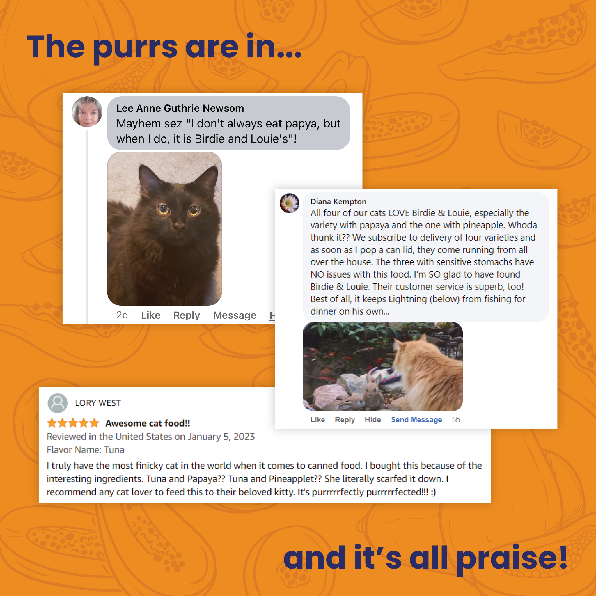 Got a picky eater? Birdie & Louie’s tuna-based recipes will have even the fussiest pets saying, "More, please!" This isn’t your run-of-the-mill fish – it’s a flavor-packed, irresistible feast that's been proven to turn nose-up moments into purrfect joy. Rich in omega-3s and high-quality protein, it’s as nutritious as it is delicious. Plus, we source our tuna responsibly, so you can feel good about every bite they devour. Say goodbye to food battles and hello to clean bowls – Birdie & Louie’s got the secret sauce for happy pets and a happy planet. One taste, and they’ll be hooked!
